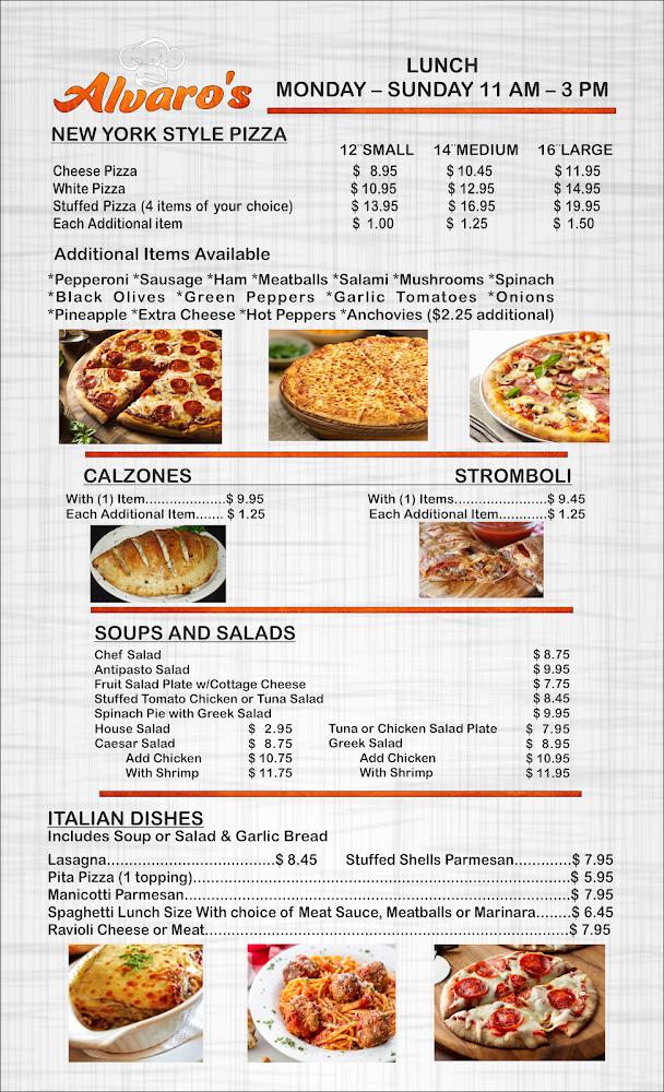 Welcome to Alvaro's Family Restaurant, where every dish is crafted with love and care! Located at 14512 S Tamiami Trl in North Port, FL, we pride ourselves on serving fresh Italian delicacies, from homemade pizza dough to authentic pasta. Our cozy, family-friendly atmosphere is perfect for any occasion—whether it’s breakfast, lunch, or dinner. Enjoy your meal in-house, dine solo, or take advantage of our convenient delivery and takeout options. Indulge in excellent desserts, a variety of teas, and a selection of local specialties. Join us for a delightful dining experience that feels just like home!