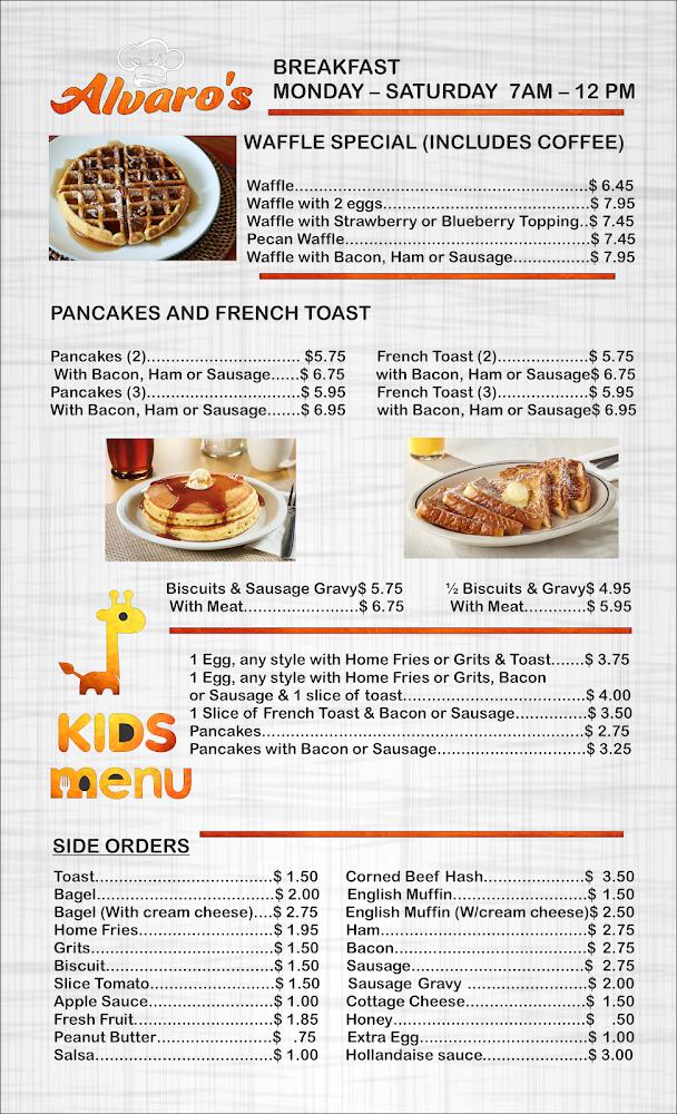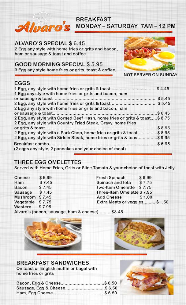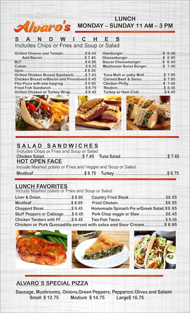 The menu at Alvaro's Family Restaurant is extensive and diverse. Options range from hearty breakfast plates, fresh salads, and delicious sandwiches to satisfying pastas and pizzas. There’s something for every palate, ensuring a wonderful dining experience.